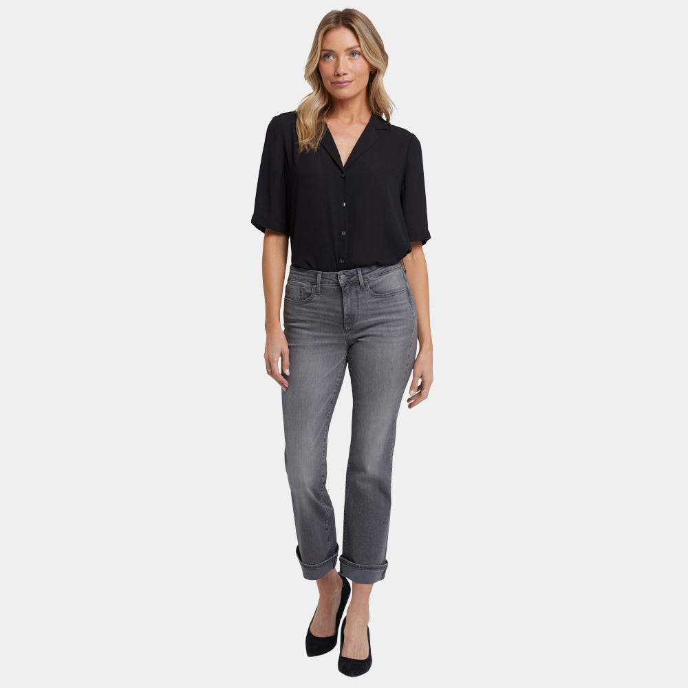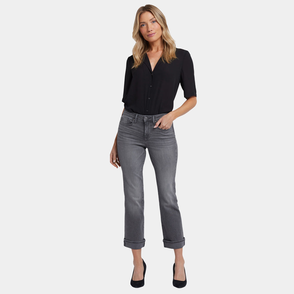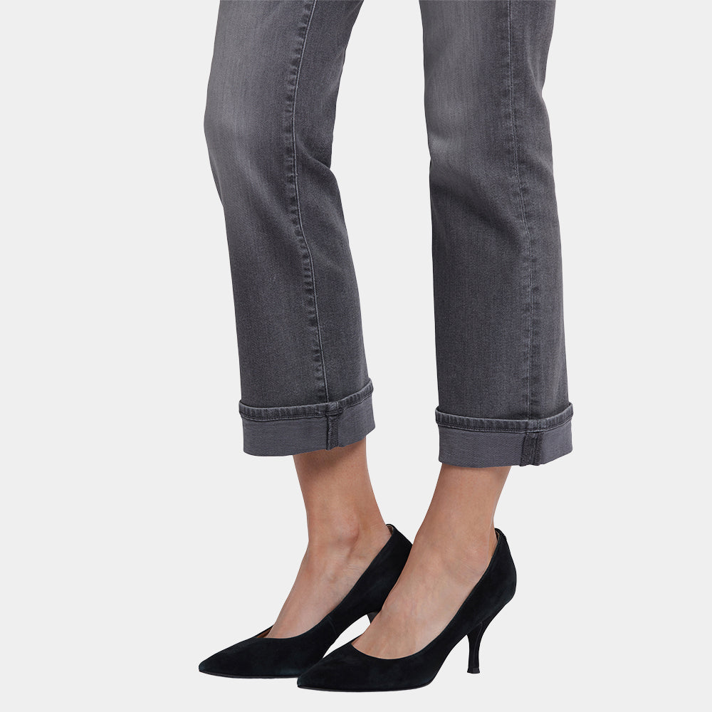 Add some fashion-forward flare to your wardrobe with NYDJ's Barbara Bootcut Ankle Jeans with 2" Single Cuff. Our exclusive Lift Tuck® Technology uses a proprietary slimming panel with a patented criss-cross design to give this comfortable, go-to style its superior shaping powers. The bootcut silhouette has a contemporary look that's fresh, playful and great for showing off your footwear. Finished with classic five-pocket styling, zip fly and button closure. This jean is made with earth-friendly methods that result in reduced consumption of water, chemicals and/or energy.