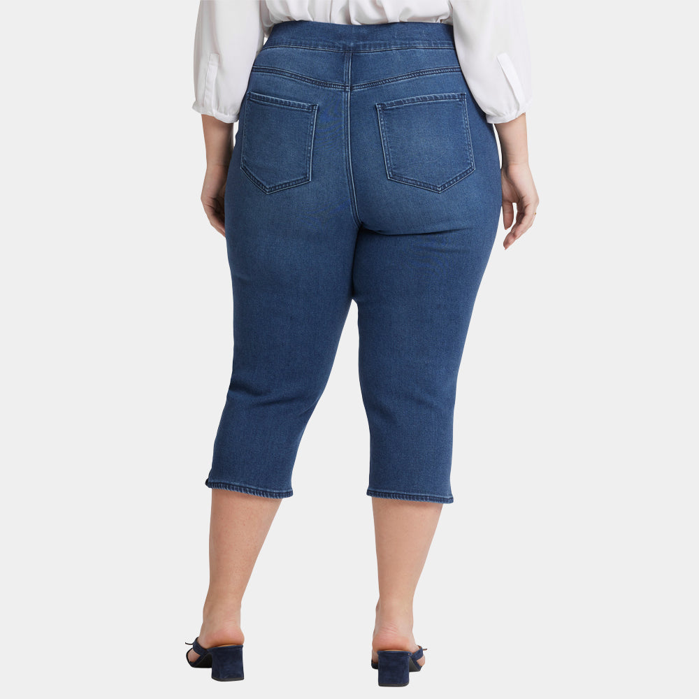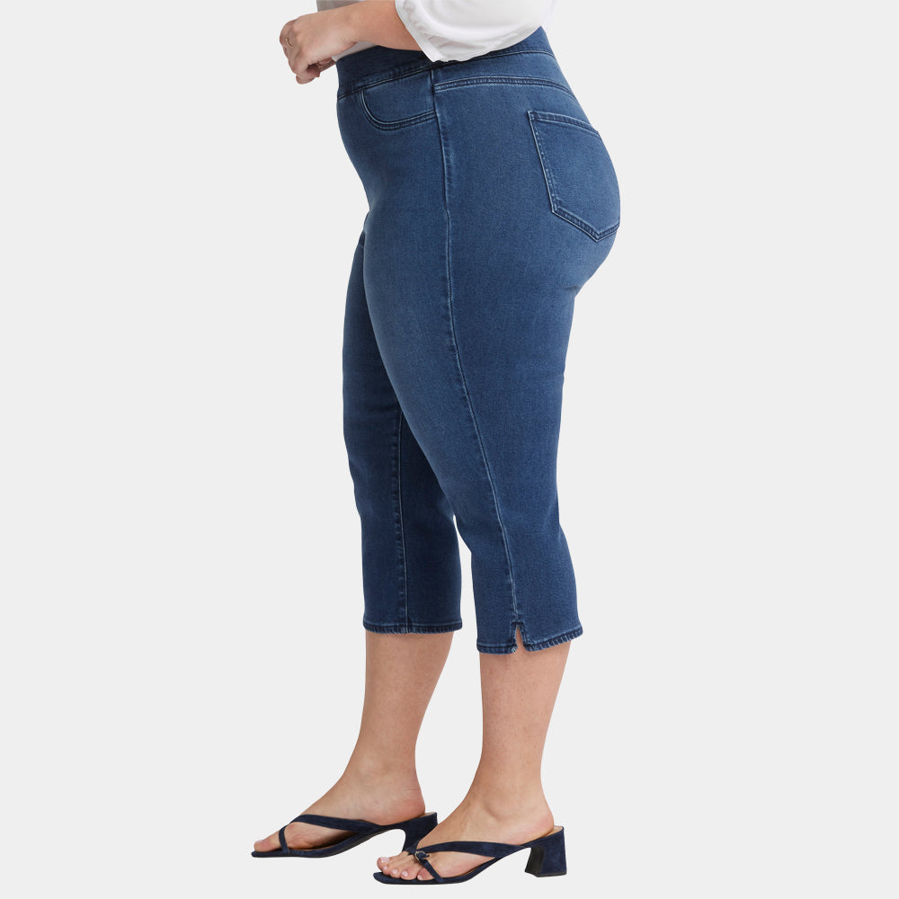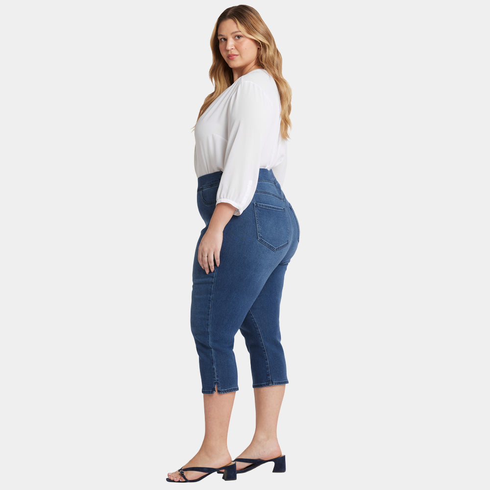 Super soft and super flattering, NYDJ's Dakota Crop Pull-On Jeans in Soft-Contour Denim™ in Plus Size with Side Slits are made from our softest denim ever, featuring a woven blend with a touch of stretch and a contouring fit that gently sculpts curves for a smooth, body-hugging look. A wide pull-on waistband comfortably holds you in, while Lift Tuck® Technology uses a proprietary slimming panel to further smooth and shape. This effortless summer style falls to a verstaile cropped length that pairs well with flats or heels. Finished with faux front pockets, a faux fly, functional back pockets and side hem slits. Olympus is a dark indigo wash with subtle whiskering on the front hips and gentle hand sanding on the front thighs and seat. This jean is made with earth-friendly methods that result in reduced consumption of water, chemicals and/or energy and with Tencel™ Lyocell, a sustainable wood-based fiber.