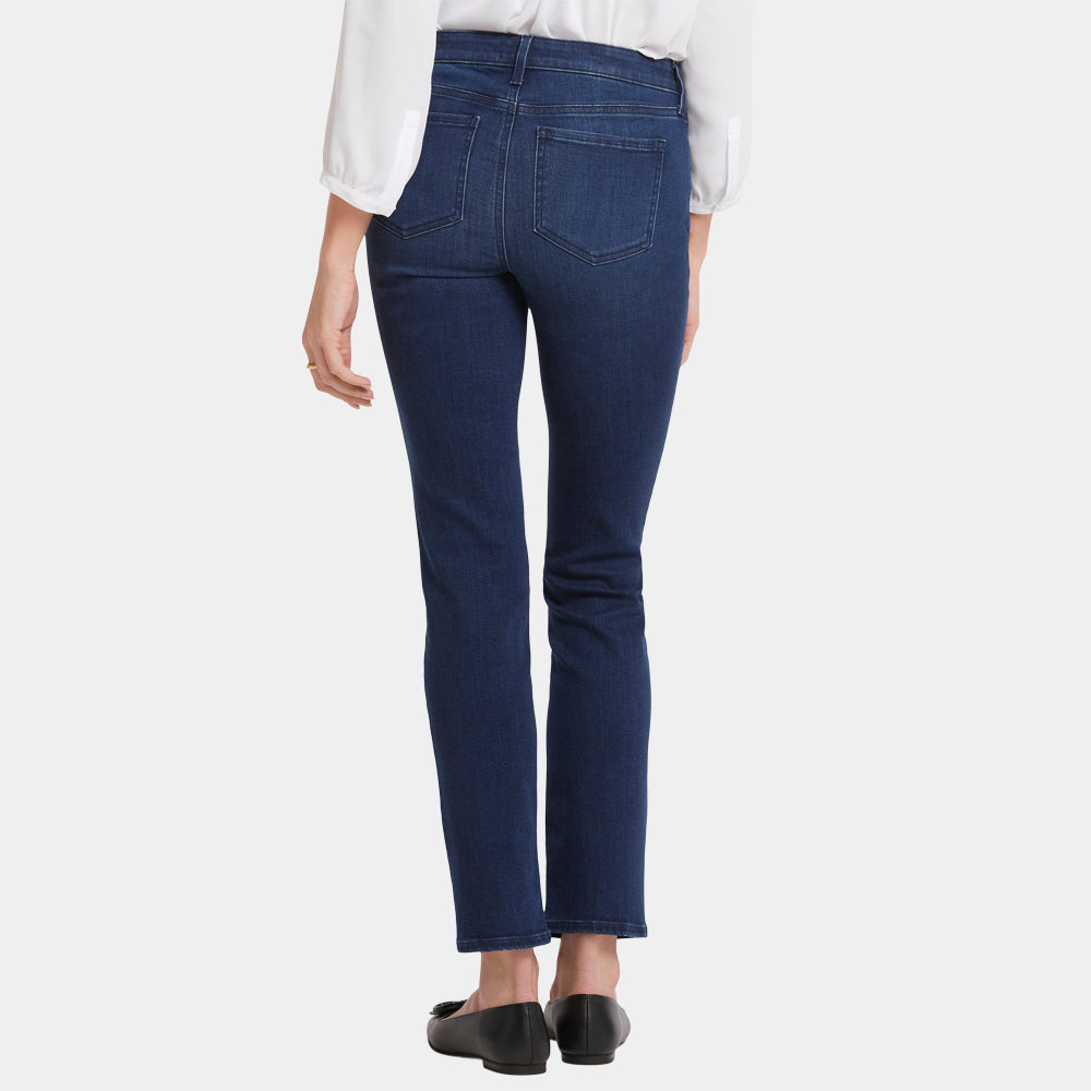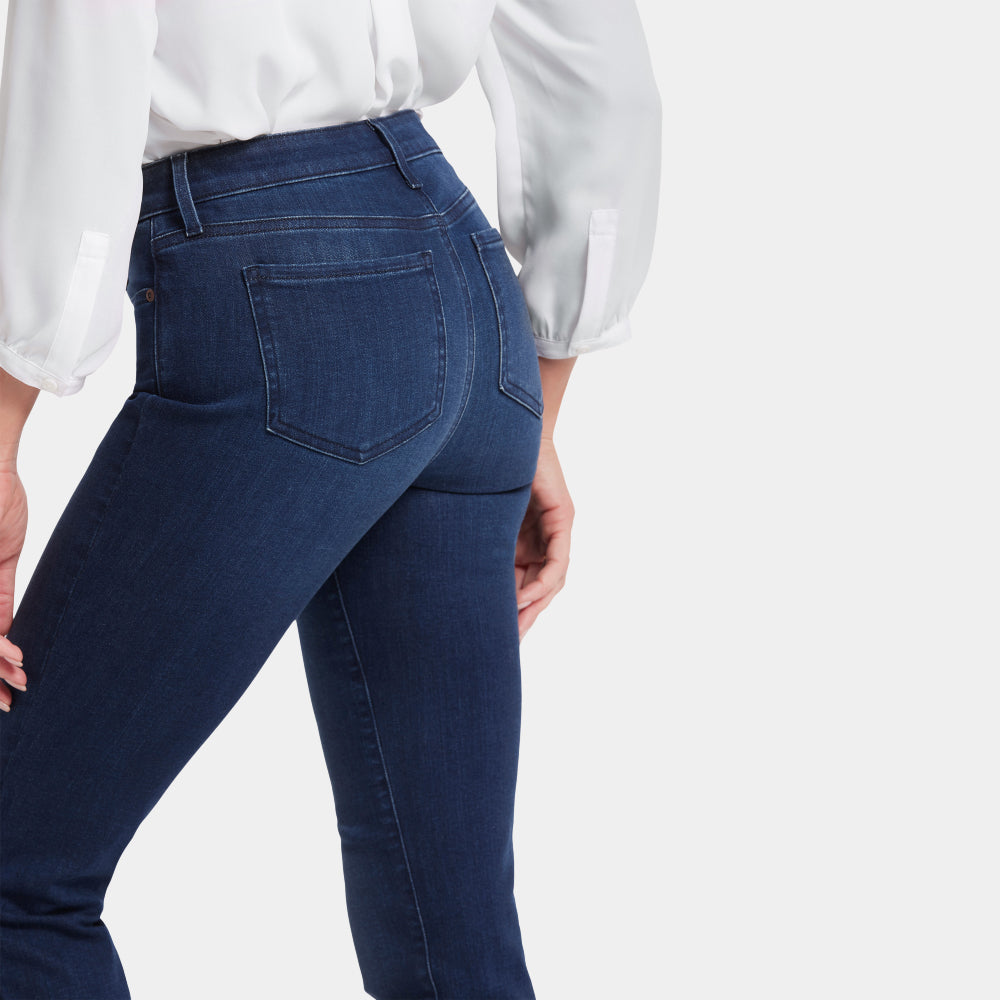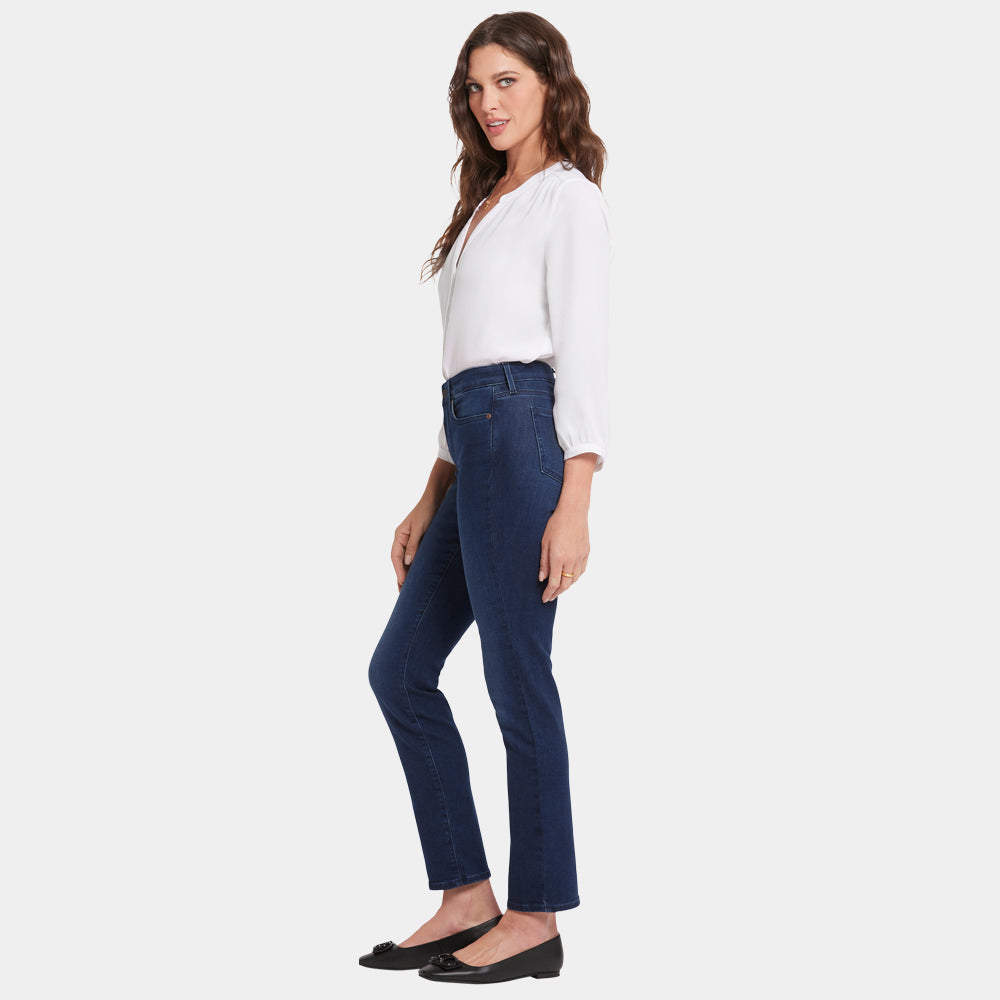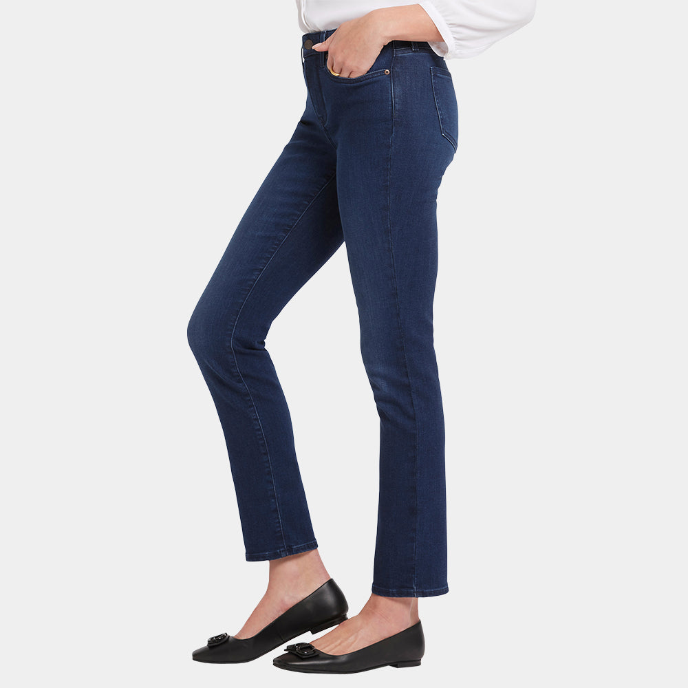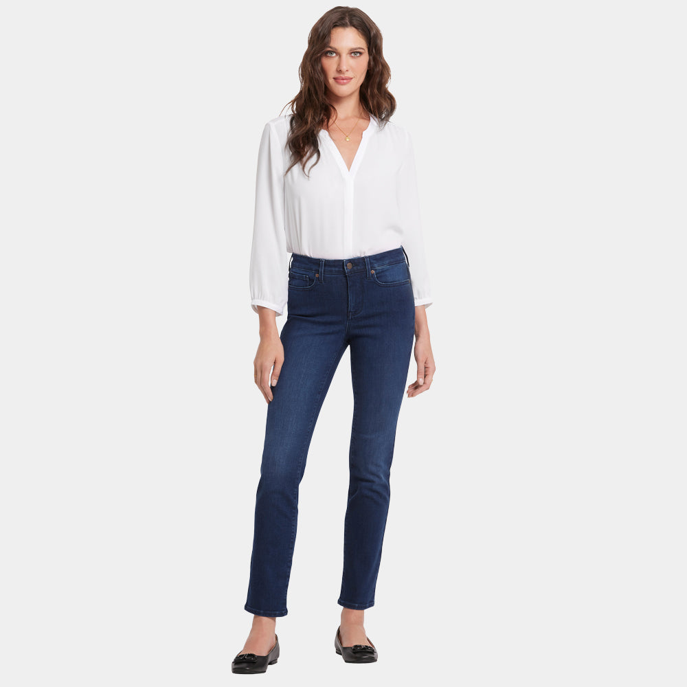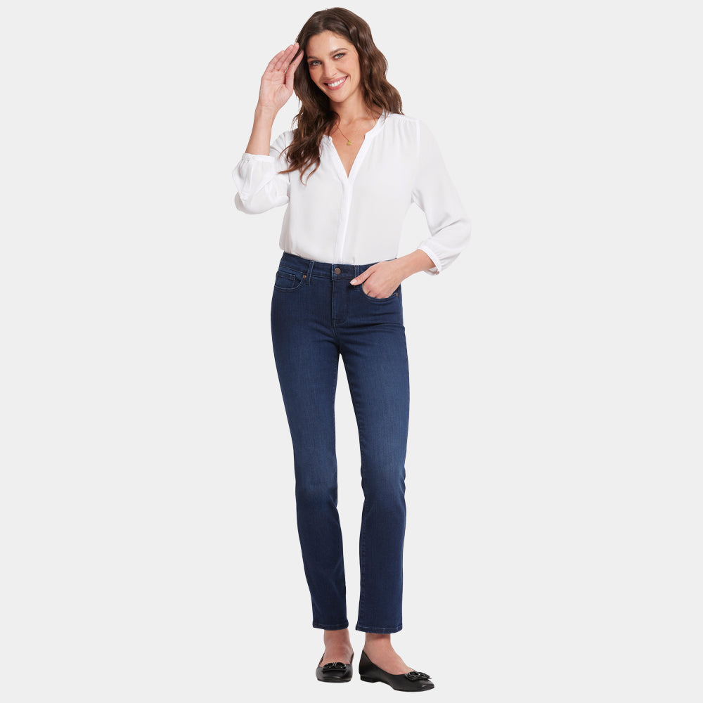 Between skinny and straight, you'll find the perfect body-hugging slim fit in NYDJ's Sheri Slim Jeans. Lift Tuck® Technology uses a proprietary slimming panel with a patented criss-cross design to shape and support your curves for an always-sleek silhouette. Features classic five-pocket styling, zip fly and button closure. This jean is made with earth-friendly methods that result in reduced consumption of water, chemicals and/or energy.