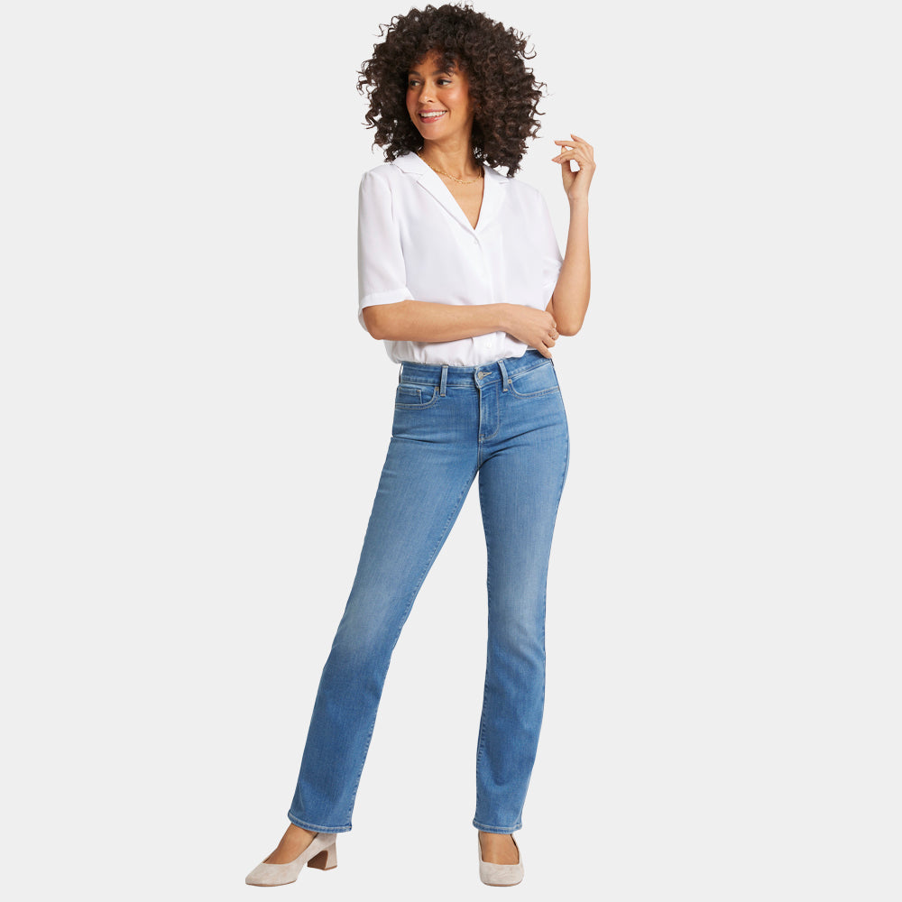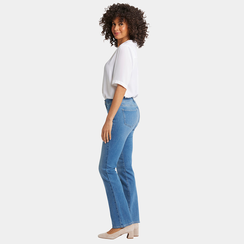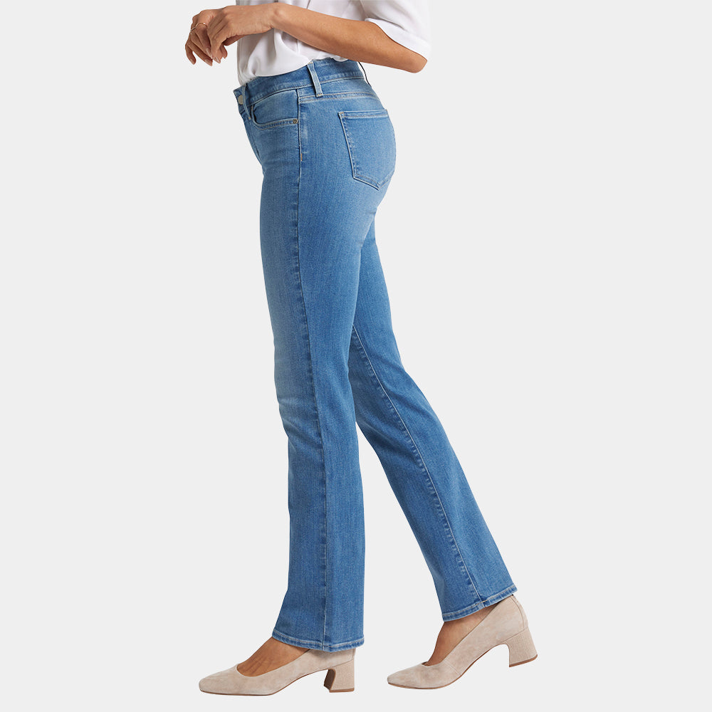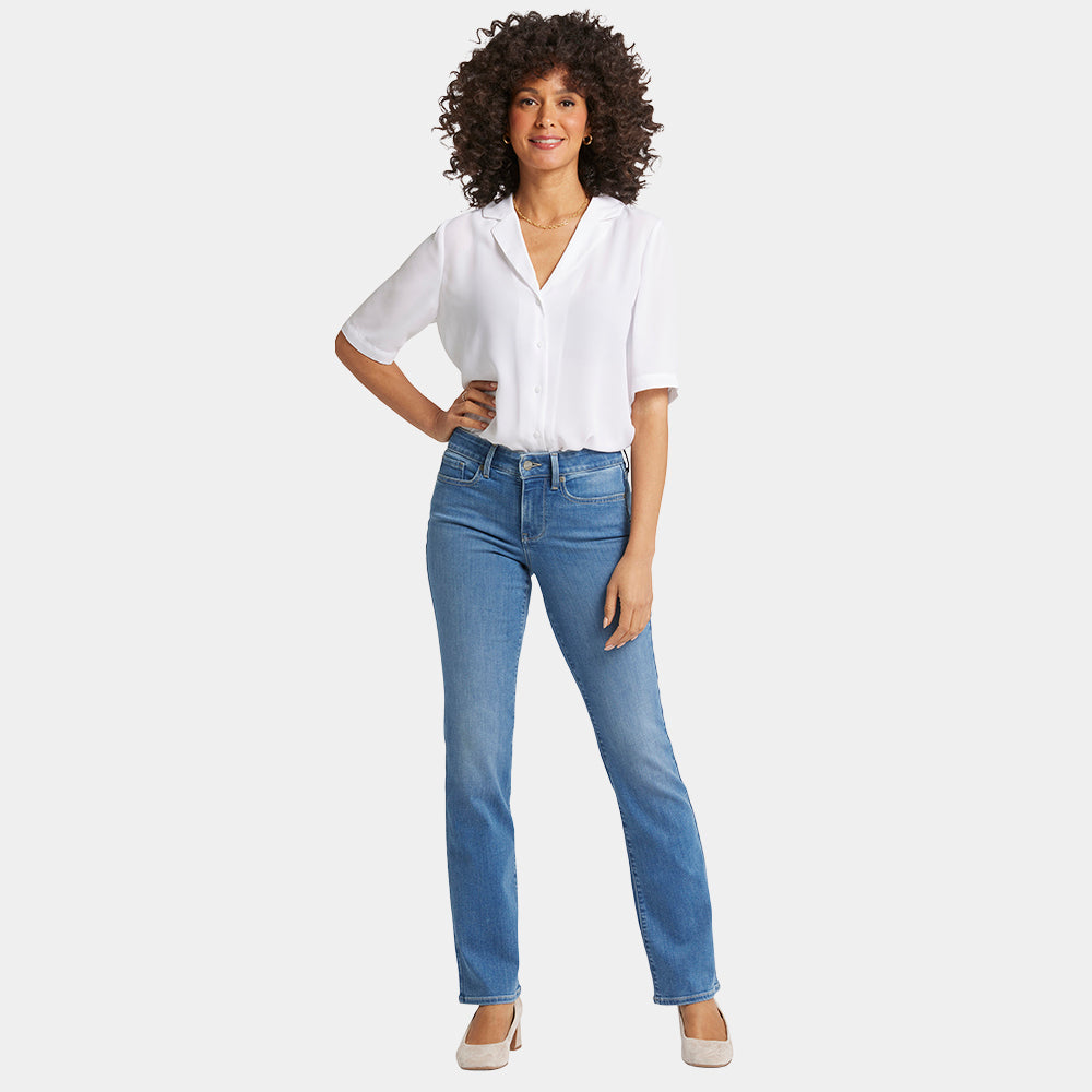 You can't go wrong with our iconic bestselling fit. The curve-sculpting, figure-elongating construction of NYDJ's Marilyn Straight Jeans pairs well with everything, in a versatile straight-leg silhouette. Our Lift Tuck® Technology uses a proprietary slimming panel with a patented criss-cross design to shape and support your curves. Finished with classic five-pocket styling, zip fly and button closure. Abliss is a medium-light blue wash with whiskers and sanding.